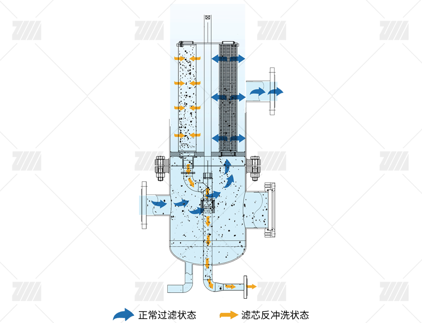 在反冲洗过程中,各滤筒依次进行反冲洗操作,确保滤网安全,方便清洗,而其他滤筒不受影响继续过滤。