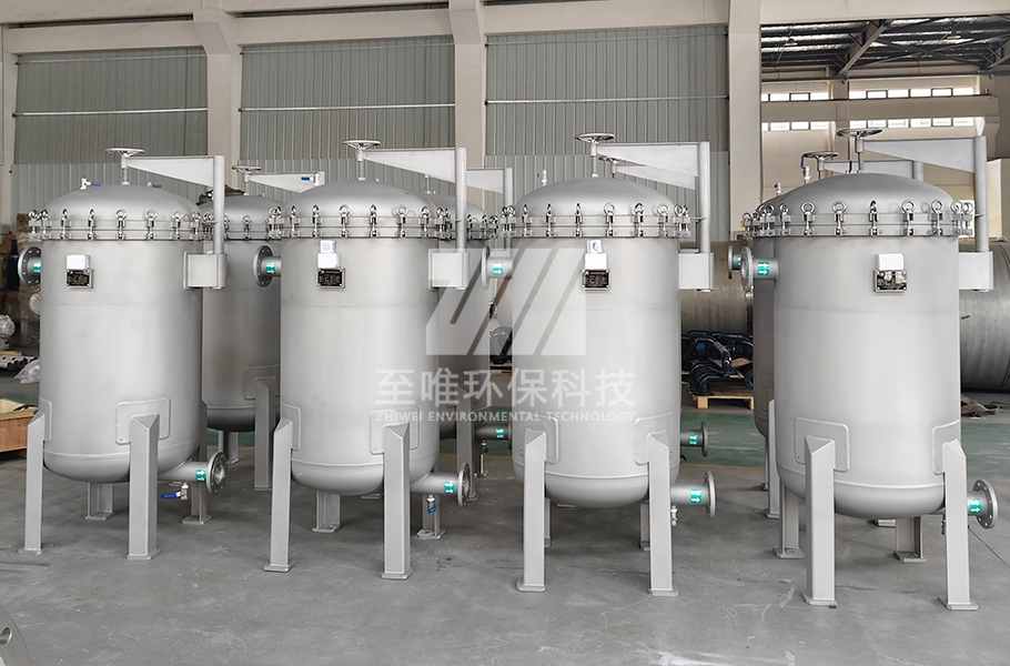 至唯多袋式过滤器,适用于流量40~1000m³/h的工况,采用侧进底出方式(也可采用底进底出方式),通过管道中的压力将过滤液体介质压入或抽入过滤器桶体,要过滤的液体介质经由电抛光冲孔支撑滤蓝承托的过滤袋的过滤,产生理想的固液分离达到液体介质被过滤的效果。至唯多袋式过滤器还可根据客户要求定制。
