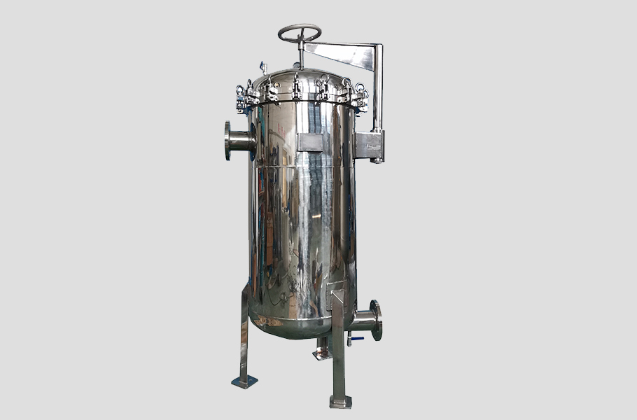 精密过滤器采用成型的滤材,利用滤芯的孔隙进行机械过滤,在压力的作用下,使原液通过滤材,水中残存的微量悬浮颗粒、胶体、微生物等,被截留或吸附在滤芯表面和孔隙中,滤液透过滤材流出,随着制水时间的增长,滤芯因截留物的污染,其运行阻力逐渐上升,当运行至进出口水压差达0.1MPa时,应更换滤芯。